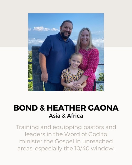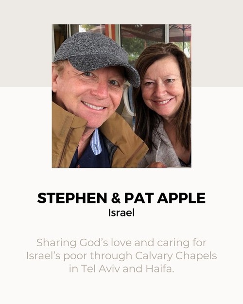 We believe that every Christian is a "missionary" sent by Jesus (John 20:21), and that wherever God calls us to live geographically, we are to live intentionally in our communities as witnesses for Christ (Acts 1:8), whether here in North County San Diego or oversees in another nation. We also believe that the local church is to financially support those that are called to foreign missions as an extension of the local church. At Calvary Chapel Escondido, we support those who we are connected to through relationships, and we are committed to devoting 10% of our tithes & offerings toward world missions and church planting, whether it be in years of plenty or times when finances are lean. We currently give monthly financial support to 5 families (Stephen & Pat Apple; Bond & Heather Gaona; Daniel & Ana Jones; Shilo & Racquell Stratton; David & Linda Shirley), and give prayer support to other Missionary Friends, and at times financially as we are able.